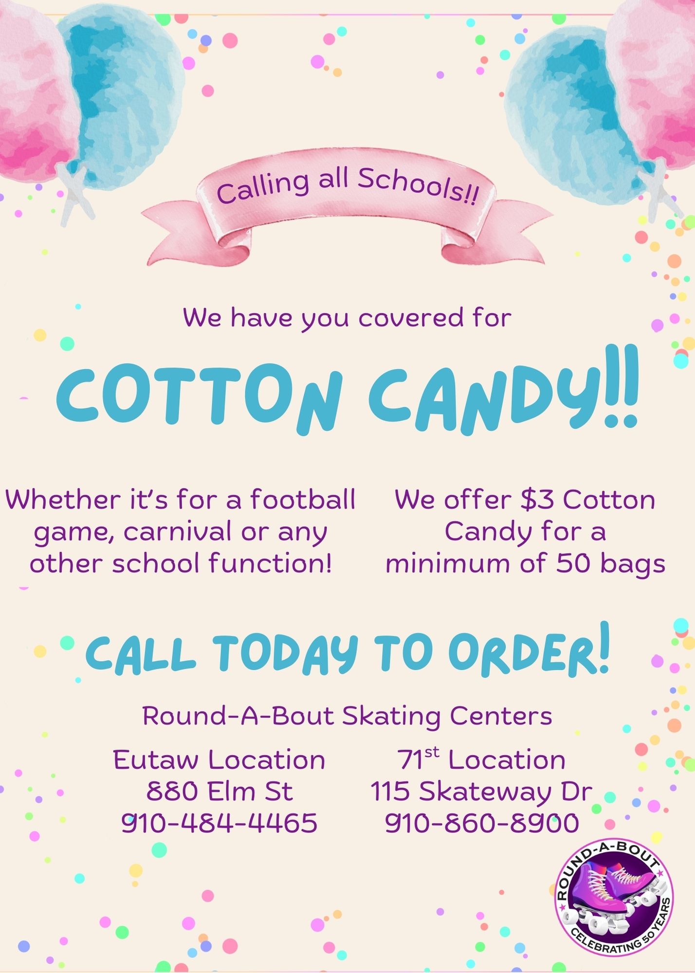 We can provide your school with stickers, pencils, or flyers to give to the students for the fundraiser! We also can offer some extra incentives such as the first 25 students in line recieve a free bag of cotton candy