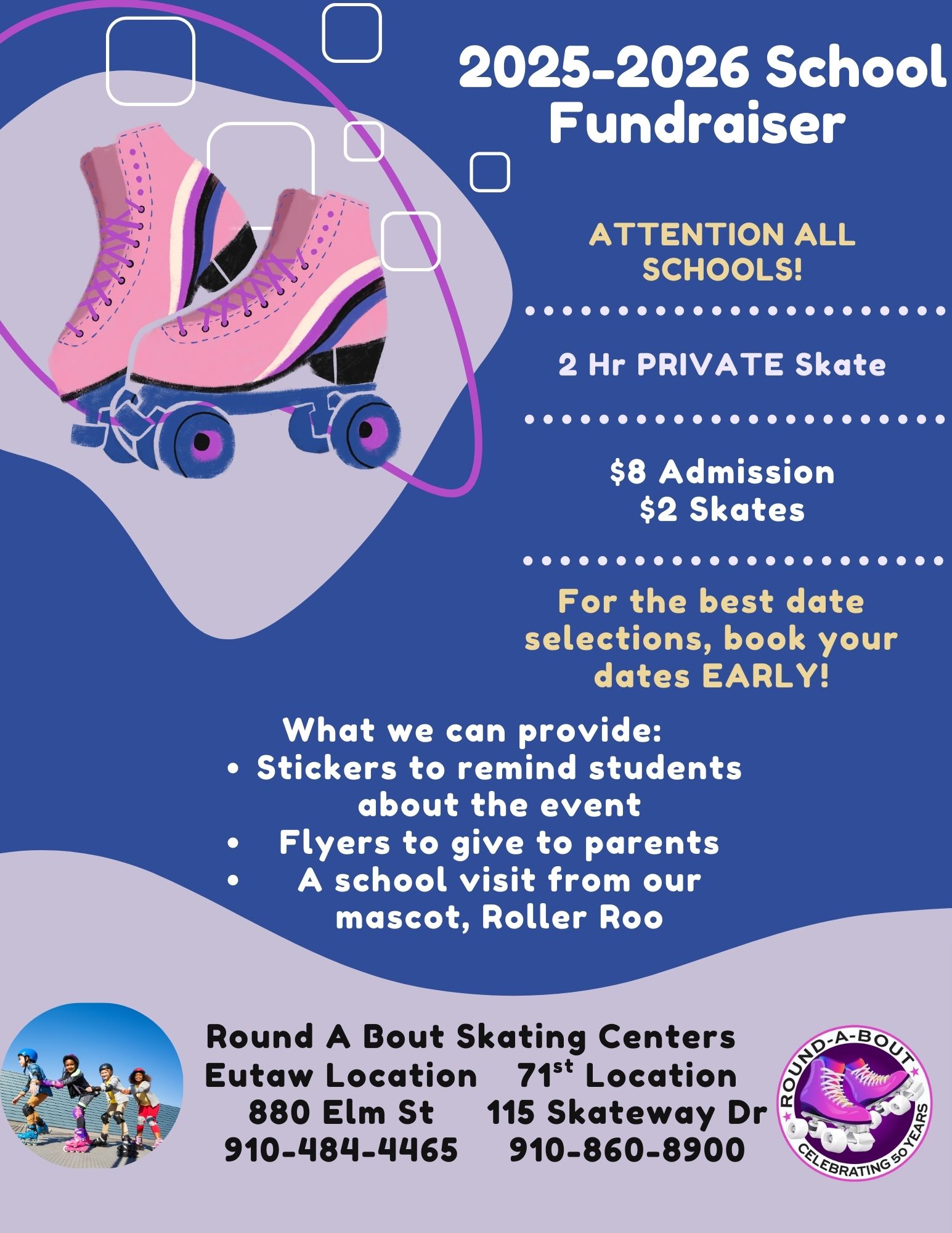 Round-A-Bout is willing to give your school 25% return on admission if you have at least 50 students that have paid admission. Admission is $8.00 and skate rentals are $2.00. The return back to you if you book two or more times will be $2.00!! We support good grades and behavior!! We are willing to give your students free admission vouchers as a reward! Please give any one of our facilities a call and let us know how many you need!
